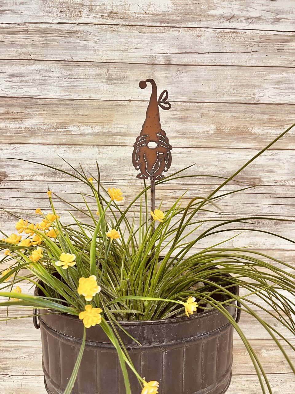 Gnome with Butterfly - From the rustic workshops of Universal Ironworks Inc, located in the heart of Prescott National Forest, we present our charming Gnome with Butterfly Plant Stake. A delightful addition to any garden or outdoor decor, this stake features a whimsical gnome, playfully interacting with a butterfly. Crafted from American-made steel and individually rusted for a unique, weathered look, this stake is perfect for year-round use. Enjoy the beauty of nature and the craftsmanship of Universal Ironworks with this unique garden accessory.